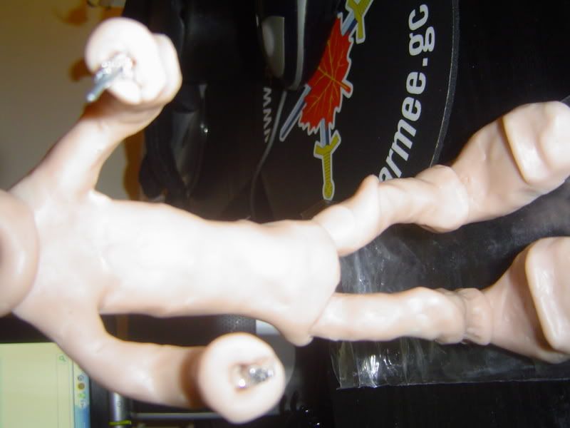 Using the hanger was okay, but the WIRE was bommmmb. IT is really the key element to everything goign well with this (at least mine since he has to stand). But yea, as of RIGHT now...all he needs is a hand and a head. There WAS a head made for him but my brother accidently smooshed it, not knowing what it was :( RIP