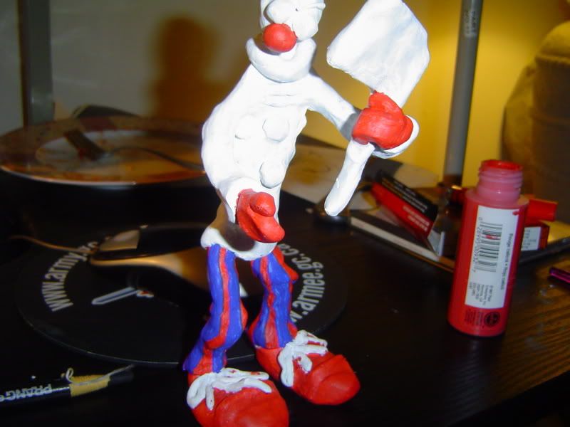 This picture is kind of blurry, but if anything you can see the shoes okay. Of course they are oversized as he is a clown and wears big shoes. I havent thought too much into what colors Im going to use for what, BUT obviously, his shoes will be red, and I'll possibly bust out a Ronald McDonald and paint the laces yellow.